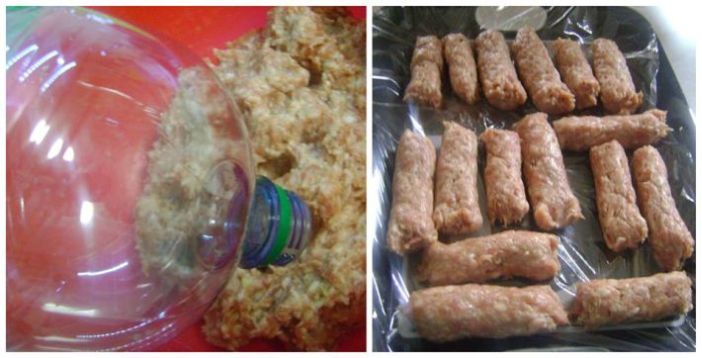 Kada je meso dovoljno odmorilo odrezati plastičnu flašu,napunite ju smjesom i kroz otvor istiskivati ćevape željene veličine.Možete ih staviti i u vrećicu za zamrzivač i odrezati vrh i tako praviti ćevape.